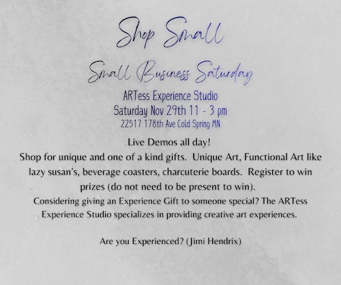 Shop for unique and one of a kind gifts. Unique Art, Functional Art like lazy susan’s, beverage coasters, charcuterie boards. Register to win Art pieces (do not need to be present to win). Live Demos all day! Considering giving an Experience Gift to someone special, the ARTess Experience Studio specializes in providing creative art experiences. Are you Experienced? (Jimi Hendrix)
