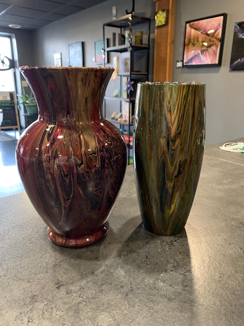 Pearlescent paint is a color shifting paint, this class will use all pearlescent paint or some, your choice in colors and designs. When the fluid art class is done the paintings need to dry before they can be taken home. Cost is 40$ per person all supplies included.