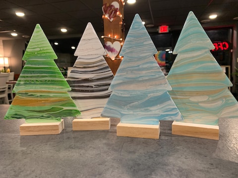 Sign up to create a set of three holiday tree decor with the fluid art technique. . The cost is $40 per person and all supplies are included.