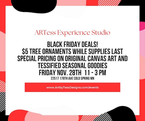 Black Friday Deals! $5 Glass Ornaments While supplies last! Special Pricing on canvas art and Tessified goodies